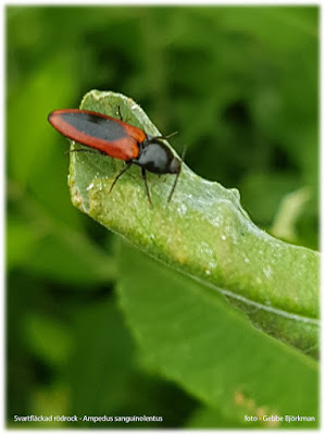 Förutom diverse mott och kryp, aspglansbaggar, luktgräsfjärilar och ängsnycklar fann jag en vacker liten skalbagge, en knäppare som har det spännande namnet Svartfläckad rödrock, Ampedus sanguinolentus. Jag letade egentligen efter en annan skalbagge, en långhorning som heter Videsmalbock, Oberea oculata; det gäller ju att passa på, men den ville inte.